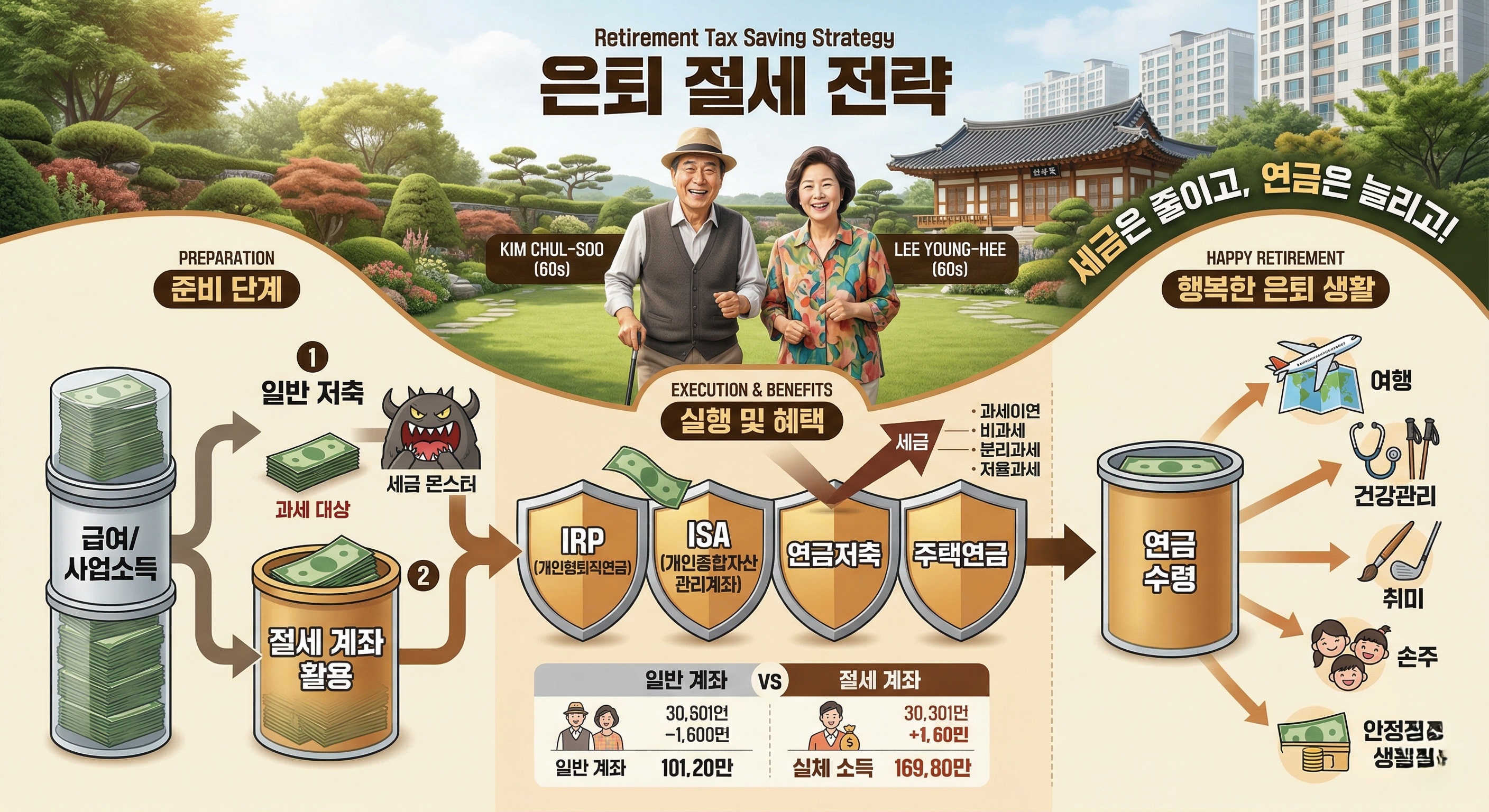 은퇴 후 마주하게 되는 가장 큰 두려움은 예기치 못한 종합소득세와 건강보험료 폭탄입니다. 평생을 바쳐 모은 소중한 자산을 단순히 은행 예금에만 묶어두는 것은 물가 상승률과 세금을 고려했을 때 명백한 마이너스 전략임을 우리 모두는 잘 알고 있습니다. 따라서 성공적인 노후 생활의 성패는 어떻게 자산을 운용하여 '절세'를 이루어낼 것인가에 달려 있습니다. 연금저축펀드, IRP 등을 적극 활용하여 과세이연의 혜택을 누리고, 비과세 상품으로 건강보험료 산정 기준에서 벗어나는 촘촘한 전략을 수립해야 합니다. 특히 기존 연금저축보험을 현금이전제도를 통해 세금 없이 펀드로 전환하여 적극적으로 굴리는 방식 등은 선택이 아닌 필수입니다. 결국 은퇴 자산 관리는 단기적인 고수익을 좇는 맹목적인 투자가 아니라, 자산을 지켜내는 튼튼한 '방패'를 세우고 꾸준한 현금 흐름을 창출하는 장기적인 마라톤입니다. 이 철칙을 명심하고 능동적으로 제도를 활용해야만 풍요로운 노후를 지켜낼 수 있습니다.